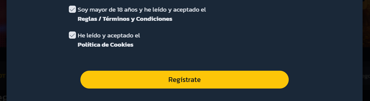 Después, confirma ser mayor de 18 AÑOS. Lee y acepta nuestros TÉRMINOS Y CONDICIONES y política de cookies.